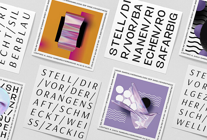 Stell dir vor Bananen riechen rosafarbig und der Orangensaft in deiner Hand schmeckt lila zackig. Kannst du nicht? Für einige Menschen ist dies allerdings Realität. Synästhesie ist eine besondere Form der Wahrnehmung in der mehrere Sinne miteinander verschmolzen sind. Töne bekommen Geschmack und Gerüche werden in Formen und Farben wahrgenommen. Die Plakatkampagne bewirbt die fiktive Ausstellung „Liquid Shapes“ die dieses Phänomen für ein breites Publikum durch interaktive Kunst erlebbar macht und mit Vorurteilen aufräumt.